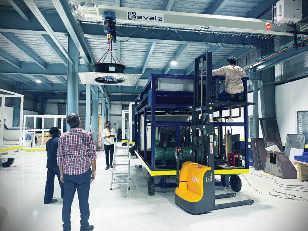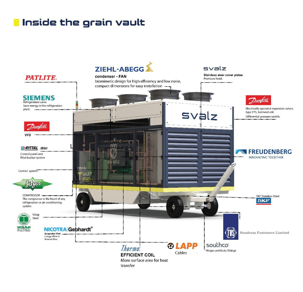 The unit’s robust construction is one of its defining strengths. The cooling coil chamber is built from 2 mm industrial-grade stainless steel to withstand extreme humidity, sulphur exposure, and abrasive dust prevalent in feed mill environments. SVALZ also developed a proprietary tropical protective coating, a first in India’s grain cooling industry, specifically designed for long-term corrosion resistance. This dramatically extends the machine’s operational life in environments where standard equipment degrades rapidly.