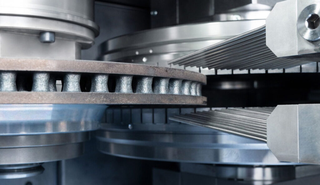 The first production lines for the new brake disks are currently being set up in the automotive industry. In the case of hard-coated brake disks, this means that turned cast brake disks are processed by laser deposition welding or gas dynamic cold spray and subsequent double-sided surface grinding. While the first part of the process chain can still build on tried-and-tested methods, laser deposition welding with the subsequent grinding process differs significantly from previous methods.